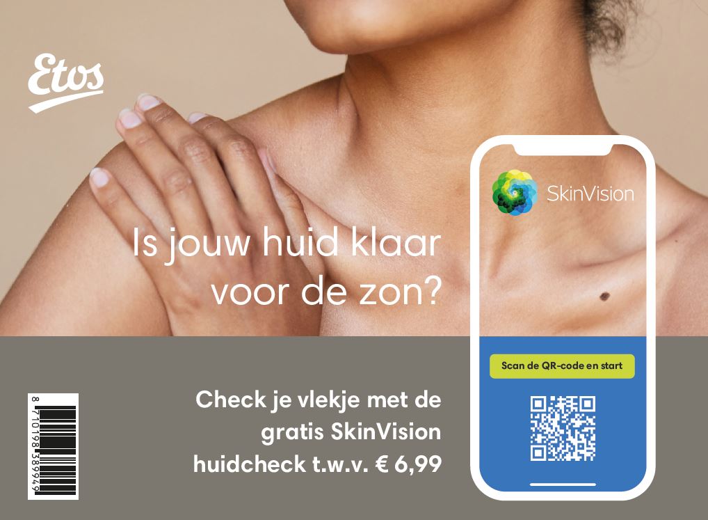 De drogisterijketen Etos slaat met Drs. Leenarts en SkinVision de handen ineen om meer bewustwording te creëren over het thema huidkanker en om vroegtijdige herkenning van verdachte (moeder)vlekjes te stimuleren. Daartoe krijgen tot en met oktober dit jaar alle klanten bij aankoop van een zonnebrand- of aftersunproduct naar keuze een voucher voor een gratis SkinVision skincheck.